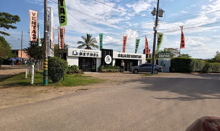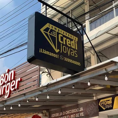 Diseñamos e instalamos una sala de ventas moderna con avisos en acrílico, estructura en alucobond blanco y negro, e iluminación estratégica que potencia la visibilidad de la marca y crea un ambiente atractivo para los clientes.