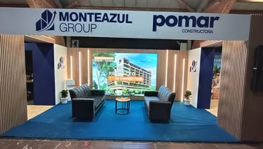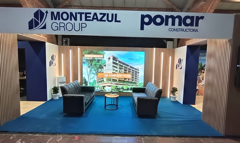 Diseñamos e instalamos un stand en Corferias (Bogotá) para la feria inmobiliaria, con paneles WPC, avisos luminosos, tapete, mobiliario premium y una pantalla LED gigante, creando una experiencia visual de alto impacto que atrae clientes y potencia la marca.