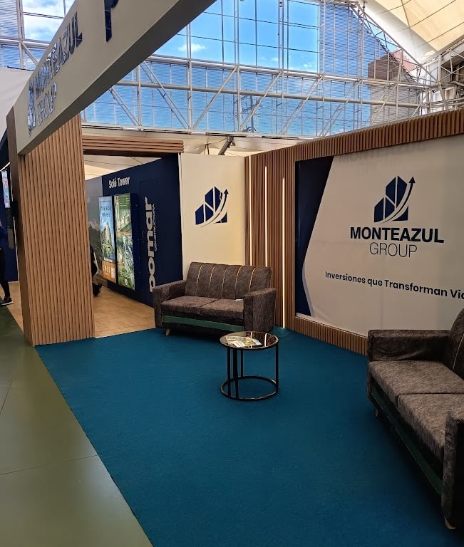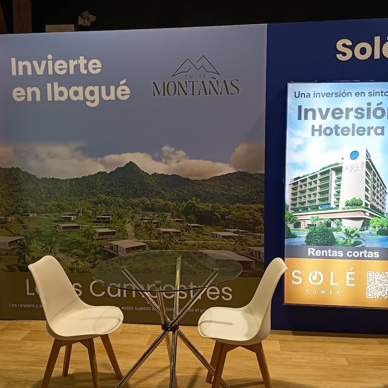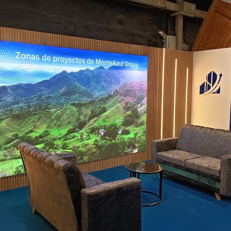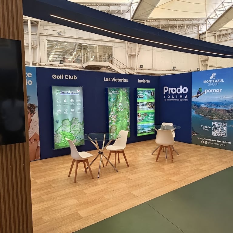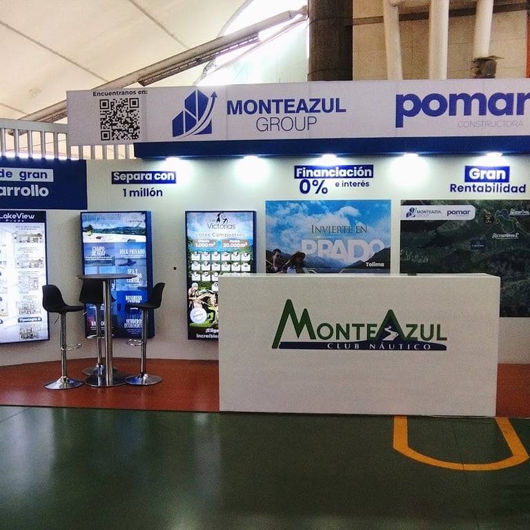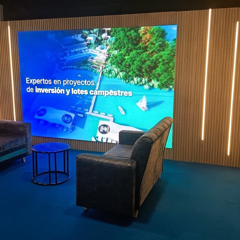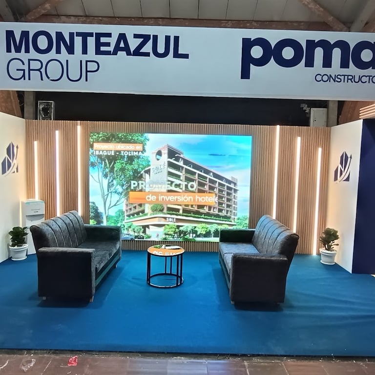 Diseñamos e instalamos un stand en Corferias (Bogotá) para la feria inmobiliaria, con paneles WPC, avisos luminosos, tapete, mobiliario premium y una pantalla LED gigante, creando una experiencia visual de alto impacto que atrae clientes y potencia la marca.