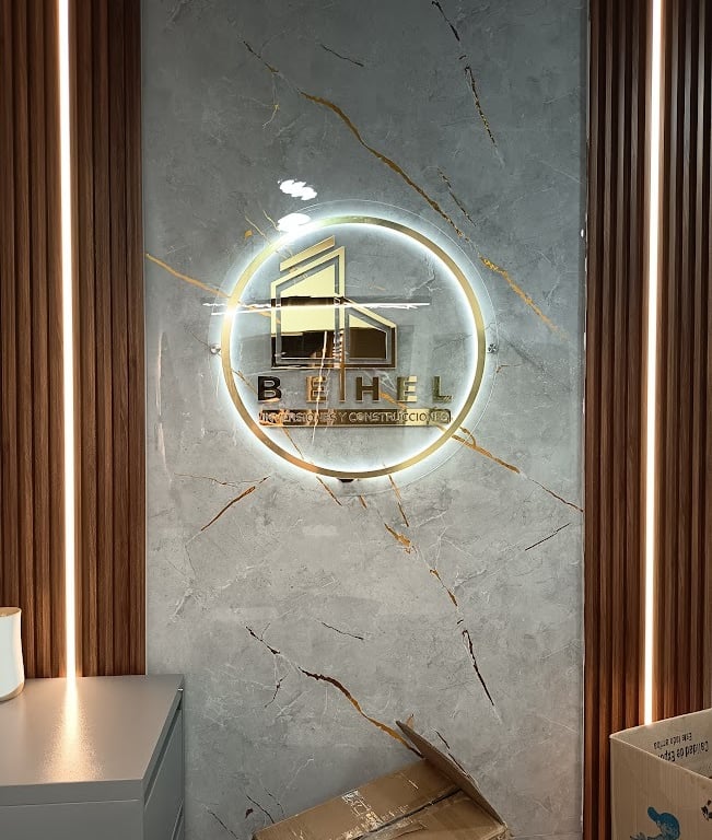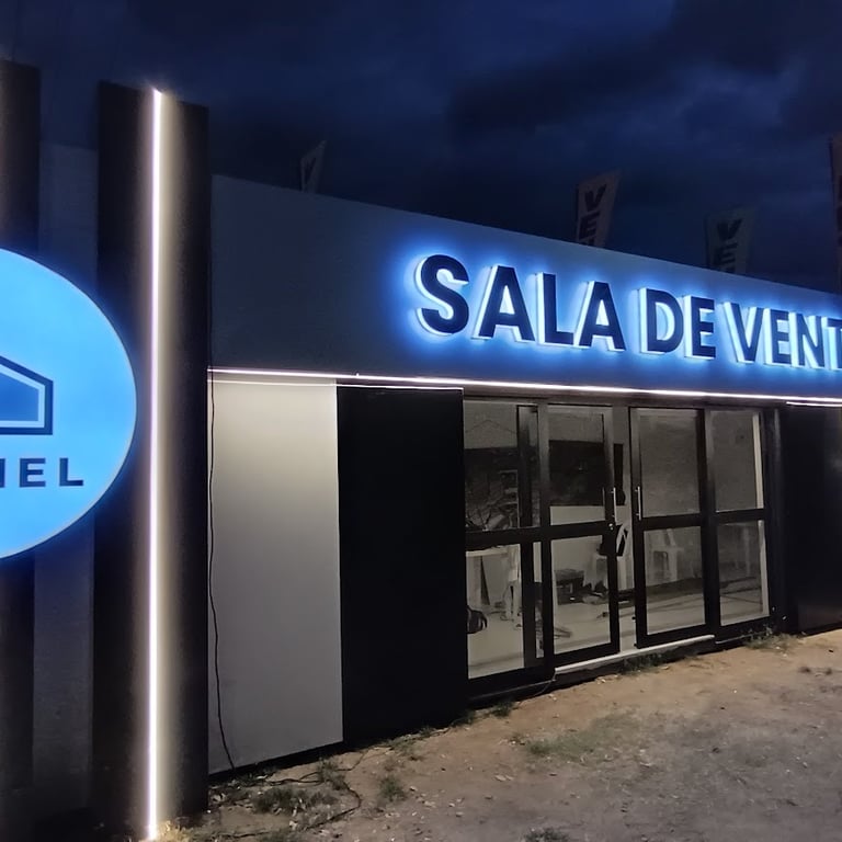 Diseñamos e instalamos una sala de ventas moderna con avisos en acrílico, estructura en alucobond blanco y negro, e iluminación estratégica que potencia la visibilidad de la marca y crea un ambiente atractivo para los clientes.